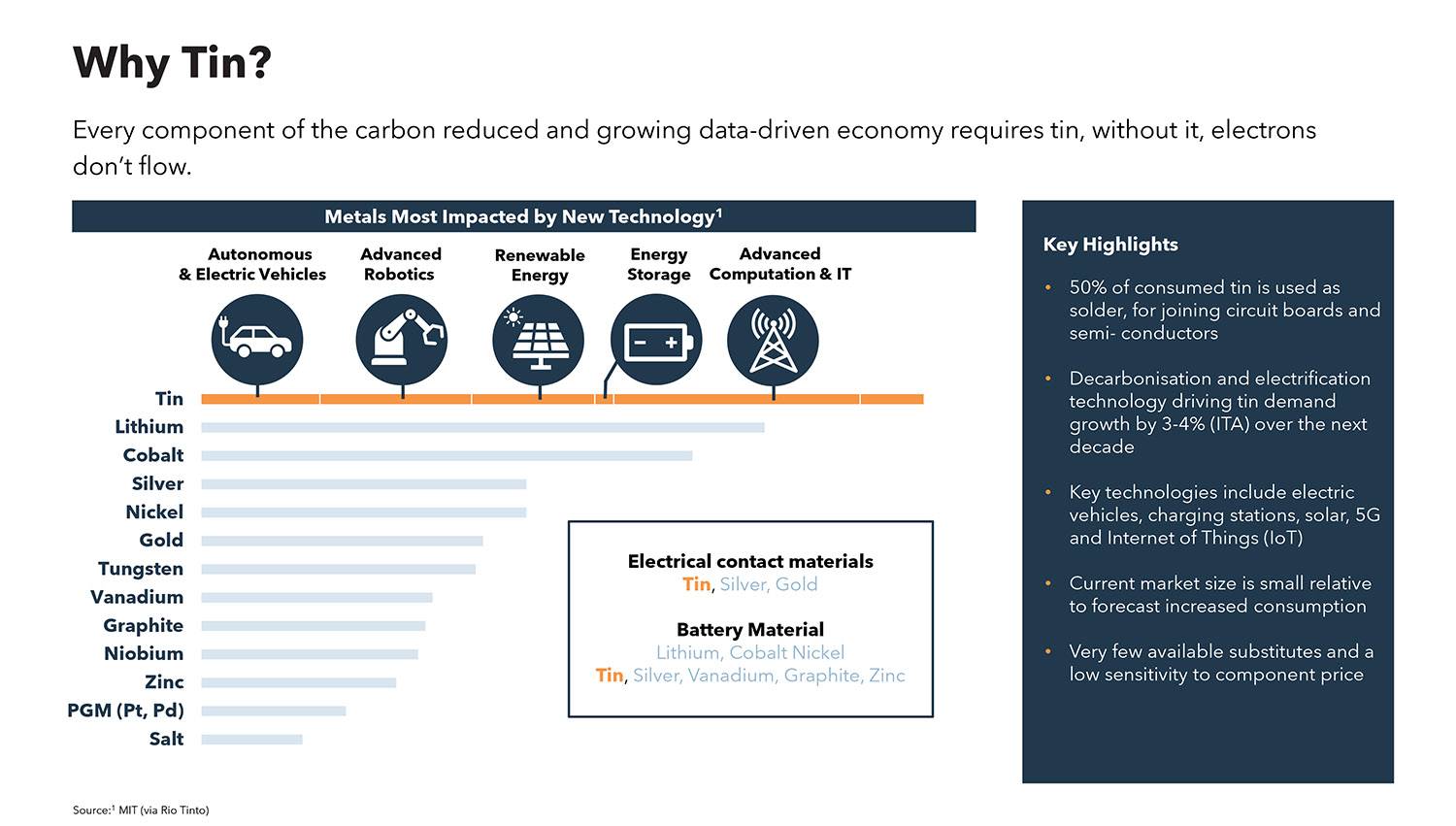 - TinOne's projects are well-positioned to capitalize on the increasing demand for tin, driven by technology, decarbonization trends and the electrification of the world.